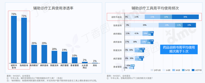 使用辅助诊疗工具查询检索是医生主动学习的重要形式之一。近 3 成医生每天都会使用说明书查询类工具。药品、指南和疾病类信息是其关键检索内容,高频使用场景则出现在门诊处方和病房医嘱时。