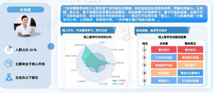 未来星以核心市场的青年医生为主,他们对前沿和实用类信息都很关注,更易接受非医学资讯类的新兴线上渠道,更侧重于提升自身的科研能力。
