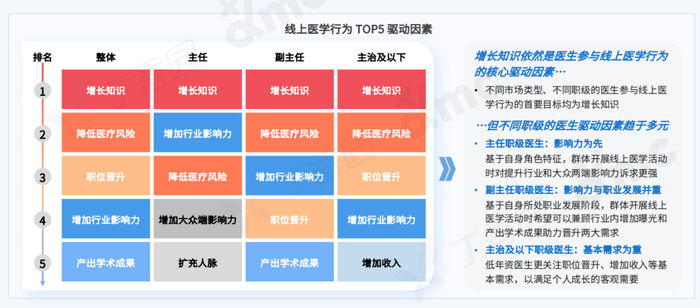 增长知识是医生参与线上医学行为的最核心动力,内科医生较外科医生在线上医学行为上投入更多时间,肿瘤相关科室等涉及复杂疾病的科室时长排名位居前列。