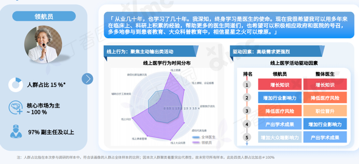 领航员以核心市场高职级医生为主,在线医学行为以主动输出类为主,增加行业和大众影响力是主要诉求。