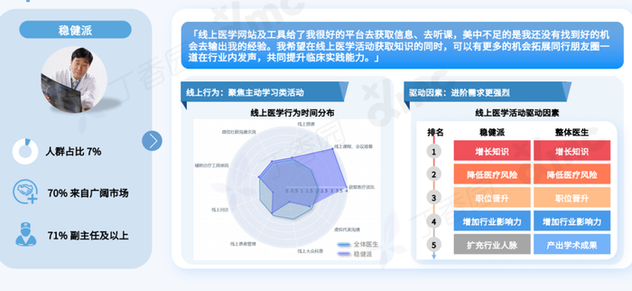 稳健派以广阔市场高职级医生为主,他们偏好阅读指南解读、知识总结和同行病例类内容,参与线上医学活动扩充人脉的诉求更强。