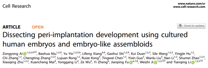 Cell Research | 李天晴/艾宗勇/季维智在人着床胚胎模型构建以及着床期胚胎发育机制的解析上取得重要进展