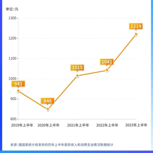 医疗保健消费涵盖着整个医疗健康,相当于医院和药店的综合消费。据国家统计局历年发布的统计数据发现,同比近五年上半年人均医疗保健消费支出,2019年上半年、2020年上半年、2021年上半年、2022年上半年、2023年上半年,人均医疗保健消费分别为941元、848元、1015元、1041元、1219元。虽然2020年人均医疗保健消费有所回落,但2021年已出现逐渐增加趋势。