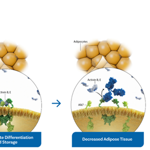 当前Versanis Bio的先导项目是bimagrumab,这是一款靶向激活素IIA型受体(ActRIIA)和IIB型(ActRIIB)的单克隆抗体,可结合ActRIIA和ActRIIB从而阻断激活素(activin)和肌肉生长抑制素(myostatin)介导的信号转导过程,靶向此通路有望在驱动脂肪流失的同时,增加患者身体的肌肉组织。