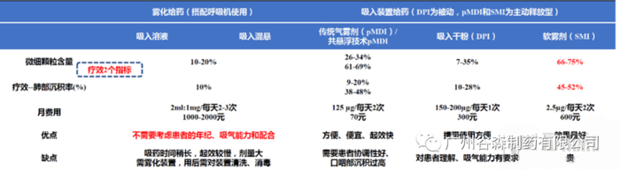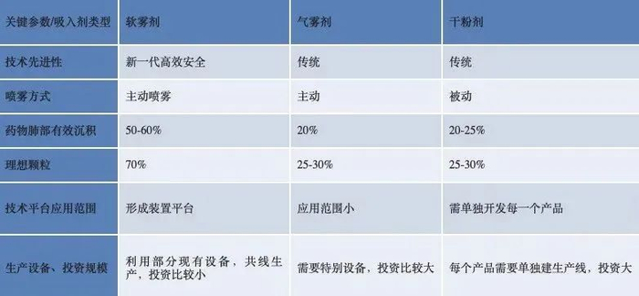 哮喘/COPD口服药和注射剂的使用局限性和临床疗效不尽人意, 而吸入剂凭借诸多优点已成为临床用药主流,逐步显现出特别优益的疗效 :①肺部直接入血,起效快;②局部给药,提高药物在靶器官的聚集,增加疗效的同时还降低了毒副作用;③无首过效应,生物利用度更高。吸入剂主要有吸入雾化溶液、气雾剂(pMDI)、粉雾剂(DPI)以及新一代吸入软雾剂(SMI)。
