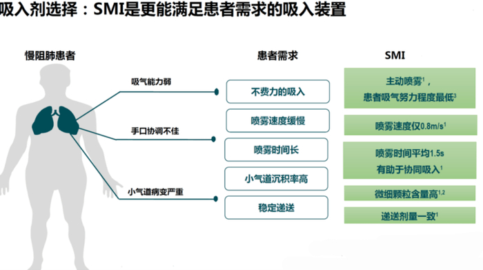 MDI(气雾剂)的喷出气流速度较快、时间短,大部分沉积在口咽部,患者无足够时间将雾滴吸收至肺部,最终肺部沉积率仅10%-20%, 且大部分老人、儿童患者无法正确使用。DPI(干粉吸入剂)依靠患者的气流将原料药与载体(乳糖)解聚集形成微粒,患者的气流速度对颗粒分布影响较大,患者的个体差异性也较大。DPI的口咽部沉积率也较高,但对湿度非常敏感,影响了药物的长期使用。SMI克服了MDI与DPI的诸多缺陷,定量被动式给药,使用方便,患者个体差异小,对湿度不敏感。软雾剂SMI(soft mist inhaler)由德国Boehringer Ingelheim公司研发的最新型吸入制剂,喷出速度较慢,便于患者吸入,粒径分布中低于5.8微米的粒子可达80%(DPI、MDI这一比例仅40%)。相比MDI与DPI,软雾的肺部有效沉积率高出接近一倍,使用更方便,剂量更低,每日仅需使用一次,临床依从性极高。