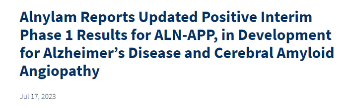 2023年7月17日,于阿姆斯特丹举行的阿尔茨海默氏症协会国际会议上,Alnylam Pharmaceuticals公司于宣布了一种新型治疗阿尔茨海默氏症(AD)的RNAi疗法,揭示了用药一次后就能在6个月内将AD相关的蛋白质水平降低约三分之二。尽管可溶性淀粉样前体蛋白β(sAPPβ)水平随着时间的推移开始回升,但该蛋白仍降低了65%以上。