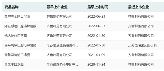 目前在国内,口溶膜制剂一般属于2类改良型新药,已上市的品种较少。根据药融云数据-中国药品批文查询,截至2023年05月共有6个品种获批上市,分别为奥氮平口溶膜、孟鲁司特钠口溶膜、他达拉非口溶膜、昂丹司琼口溶膜、阿立哌唑口溶膜、盐酸美金刚口溶膜,主要集中在齐鲁制药、江苏恒瑞和江苏豪森这三家。