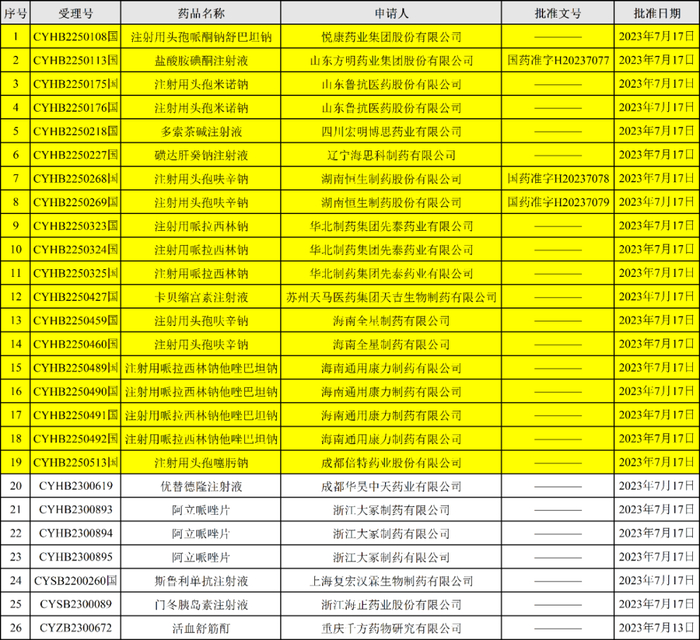 刚刚,NMPA发布2023年07月20日药品批准证明文件送达信息,本批次共有26个受理号获批,其中包括19个一致性评价受理号,过评品种为: