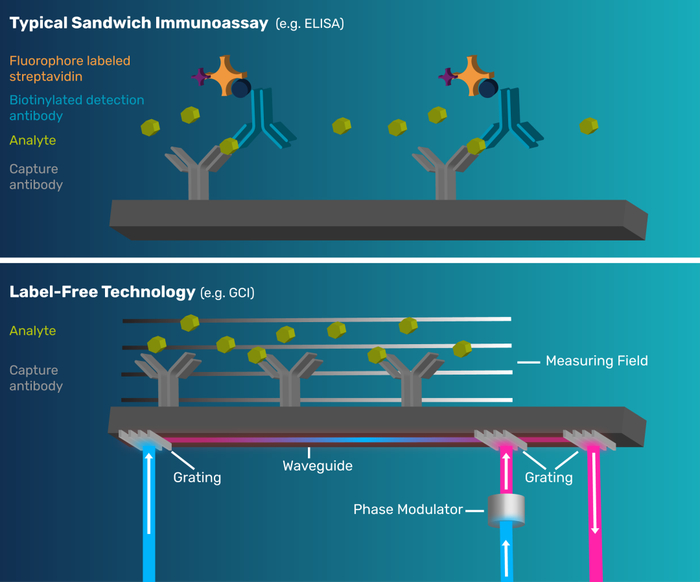 传统ELISA技术与非标记光栅耦合干涉技术的原理对比