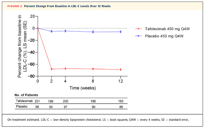 这项随机、双盲、安慰剂对照、3期研究,在2021年2月~2022年1月期间纳入中国32个研究中心、根据Simon Broome标准诊断为杂合子家族性高胆固醇血症(较为常见的高遗传性疾病)或心血管高危或极高危的非家族性高胆固醇血症患者,并将这些患者(n=303例)按2:1比例随机分配接受tafolecimab 450 mg每4周一次(n=205)或安慰剂(n=98),并联合他汀类药物进行为期12周的双盲治疗。在12周的双盲治疗期后,接受tafolecimab治疗的患者继续接受开放标签tafolecimab 450 mg每4周一次治疗,接受安慰剂治疗的患者交叉接受开放标签tafolecimab 450 mg每4周一次治疗,持续12周,随后进行4周的安全随访。