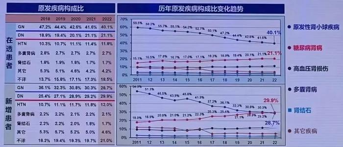 原发性肾小球疾病仍是原发疾病谱的第一位,但有下降趋势。2022年在在透析患者中所占的比例为40.1%。