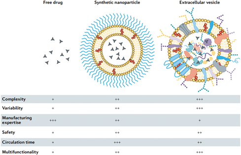 脂质体低毒性源于其成分中磷脂和胆固醇为细胞膜成分,靶向成分的添加可以提高其向病灶的主动靶向性,但是临床效果未能实现。外泌体表面进行改性,如连接其他分子如CD47或治疗性分子如神经元特异性狂犬病病毒糖蛋白(RVG)肽来达到增加循环时间或靶向性达到治疗疾病的目的。上市脂质体包在的药物均为分子量小于1000道尔顿的化合物,外泌体的载药实验从小分子如姜黄素到大分子如核酸、多肽等均有涉及。
