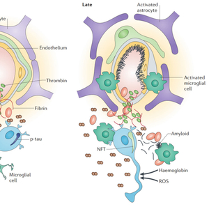 沉积的蛋白质和淀粉样蛋白阻碍毛细血管血流,导致外排泵失败,代谢废物积聚,pH和电解质组成发生改变,随后突触和神经元功能障碍。神经原纤维缠结 (NFT) 会因缺血性损伤和淀粉样蛋白β水平升高而积累。小胶质细胞和星形胶质细胞的活化与明显的炎症反应有关。