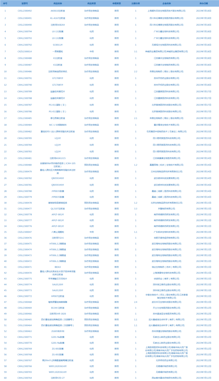 国家药监局药品审评中心承办受理60个新药上市申请,包括AK0610注射液等药品(截至7月18日)。