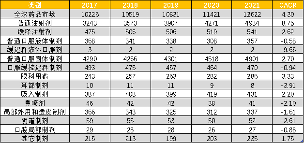 全球常见剂型的市场变化(亿美元,平均出厂价)