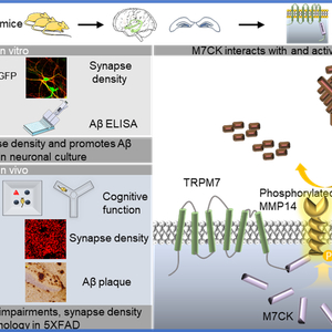 在原代神经元培养和小鼠脑中,作者还发现TRPM7的激酶结构域与MMP14(一种参与降解Aβ的金属蛋白酶)相互作用并将其激活。TRPM7的激酶结构域对淀粉样蛋白的沉积的影响是通过其激酶段直接激活蛋白酶MMP14的活性所介导的,并通过MMP14促进其脑内Aβ的降解和清除。
