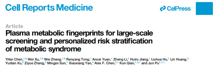 近日,上海交通大学医学院附属仁济医院心血管内科、肿瘤系统医学全国重点实验室卜军教授课题组联合上海交通大学生物医学工程学院钱昆教授课题组以及上海交通大学医学院附属新华医院陈丰原教授课题组在Cell子刊《Cell Rep Med》在线发表最新研究成果。该研究基于在十三五国家慢病重点研发计划资助下建立的前瞻性大样本中国人群队列的四年随访,系统性绘制了代谢综合征(MetS)及其临床前期患者的血浆代谢指纹图谱,创新开发了基于机器学习框架的大型自然人群队列社区筛查与诊断平台,建立了血浆代谢指纹在真实世界环境中预测个体代谢风险状态的新方法和新模型。这一成果为社区人群代谢危险因素和慢病防控提供了早诊早筛和风险预警的新技术。