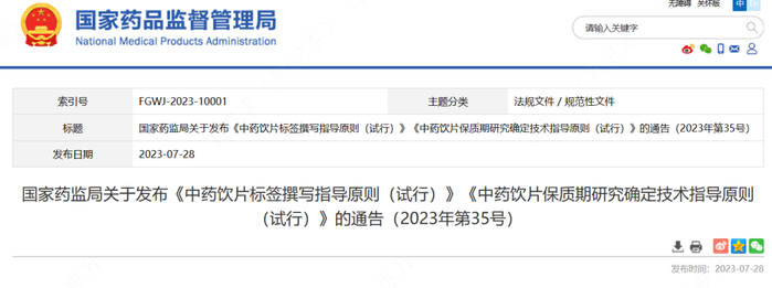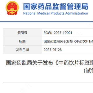 2023年07月28日,为指导企业规范撰写标签内容、合理确定中药饮片的保质期,国家药监局发布了《中药饮片标签撰写指导原则(试行)》《中药饮片保质期研究确定技术指导原则(试行)》。