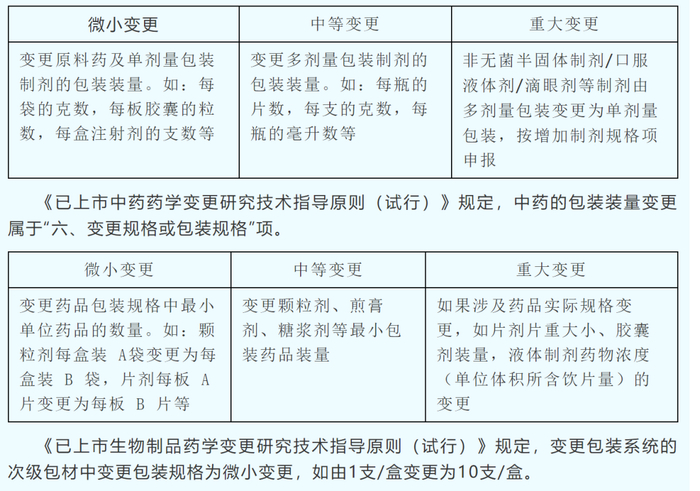 其次,对于包装装量(或称包装规格)变更,化学药品和中药、生物制品的药学变更研究技术指导原则的规定分别如下:
