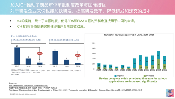 中国加入ICH,令何静印象最深的是能加速国外创新药进入中国,ICH E5、E17、M4、M3等指导原则帮助跨国公司及早将中国纳入国际同步开发,令中国产生同步试验数据、同步递交和同步注册,降低了研发成本,体现了国际社会对中国新药研发能力和质量的信心提升。