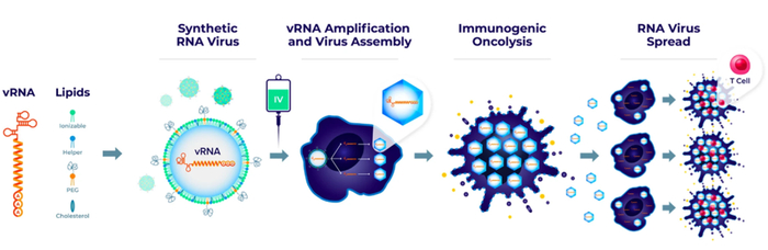 除上述两种改良单纯疱疹病毒溶瘤病毒管线,剩下的另外两条管线为合成病毒,ONCR-021和ONCR-788。2022年10月,Oncorus在Nature Communications发表了题为:Development of intravenously administered synthetic RNA virusimmunotherapy for the treatment of cancer的研究论文。论文表明公司研究团队通过脂质纳米颗粒(LNP)载体包裹递送溶瘤病毒RNA基因组(vRNA),可以在规避中和抗体的影响下,有效解决溶瘤病毒重复静脉给药的局限性,在多种癌症模型中发挥出显著抗肿瘤功效,从而提高了溶瘤病毒的治疗潜力[9]。