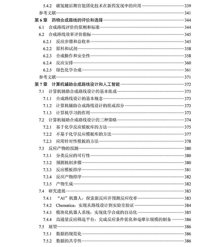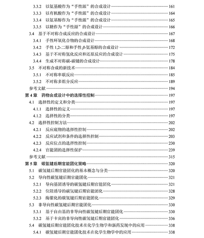 第 2 部分详细介绍了药物合成路线设计的基本策略,包括反合成分析策略、手性合成设计策略、选择性控制策略、合成路线的评价和选择等,并且对后期官能团化策略、计算机辅助合成路线 设计和药物合成新技术等前沿领域也进行了深入阐述。