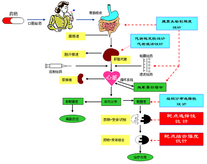 ▲图1 药物作用的体内过程与药物结构优化设计基本策略