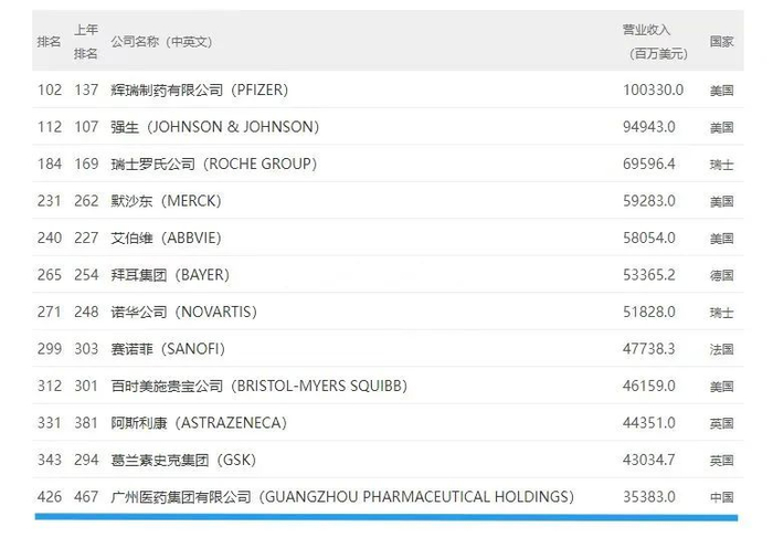 广药集团是唯一入选制药分行业榜单的中国企业