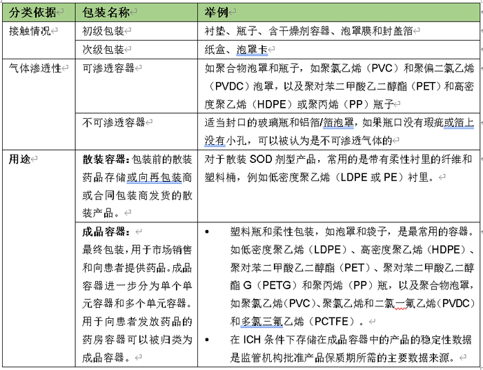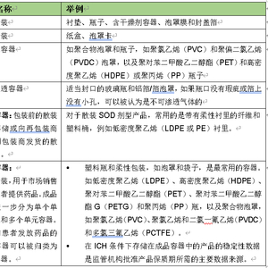 适当使用容器密封系统可以保护SOD免受湿气、光线、氧气或其他气体、微生物污染和机械应力的影响。一般来说,对湿气、光线和氧气的保护是最重要的因素。通过使用密封良好的容器,并在良好的生产规范条件下控制材料、制造和包装过程,可以轻松实现对微生物污染的控制。通过使用具有足够强度和最小化顶空的容器,可以防止产品在处理和运输过程中过度移动,从而实现对物理应力的保护。容器通常无法保护产品免受热应力的影响。对于热敏感产品,通常在储存、运输和使用过程中通过冷藏或冷冻来保护。