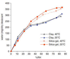 干燥剂的湿度吸附等温线可以在文献中找到。在不同温度和湿度下,硅胶和黏土的平衡吸附容量如图1所示。有一点需要注意,相同类型的不同等级的干燥剂可能具有显着不同的湿度吸附容量。因此,必须验证所选择的干燥剂的湿度吸附等温线。