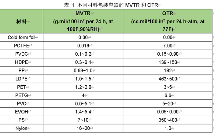 容器的渗透性是选择对于相应渗透物敏感的产品的包装材料时需要考虑的关键因素。包装材料的湿气和氧气渗透率需要检测并作为湿气/水蒸气透过率(MVTR或WVTR)和氧气透过率(OTR)报告。表1列举了一些包装材料的MVTR和OTR数据。重要的是要注意表中列出的泡罩材料的数据是指平整膜。由于成形腔的厚度降低,泡罩的渗透速率将大于平整膜的渗透速率。任何给定容器的实际尺寸,包括表面积和厚度,都应在包装设计和评估中加以考虑。