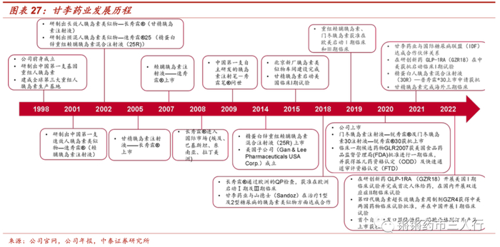 ■甘李药业1998年成立,是国内首家掌握产业化生产重组胰岛素类似物 技术的企业,在生物合成人胰岛素及其类似物的开发、研制和生产等方 面均处于国内外领先地位。公司产品线品种齐全,主要产品包括重组甘 精胰岛素注射液(商品名“长秀霖”)、重组赖脯胰岛素注射液(商品名 “速秀霖”)、精蛋白锌重组赖脯胰岛素混合注射液(25R)、门冬胰岛素注射液(商品名“锐秀霖”),在研项目集中在糖尿病领域,包括临床前研究、临床研究等阶段。