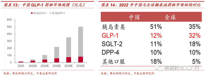 ■据弗若斯特沙利文预测,2024年有望突破百亿市场规模达至105亿元。我国GLP-1 受体激动剂等新型药物进入时间较晚、市场渗透率较低,2022年在国内整体糖尿病药物市场中合计占比12%,与发达国家市场32%的份额相比仍有较大提升空间。因此我国GLP-1市场处于快速扩张期,伴随渗透率持续提升,市场空间广阔、前景良好。