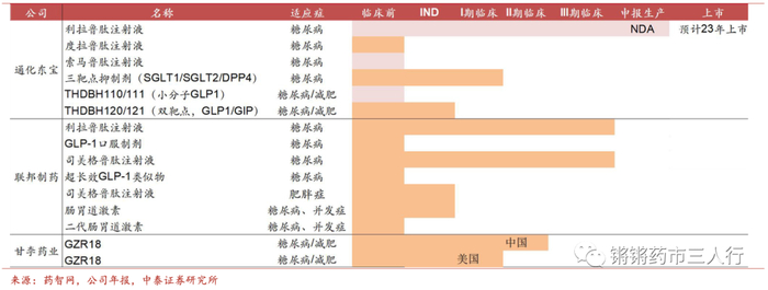 甘李药业:重点推进胰岛素复方制剂GZR101、第四代胰岛素类似物GZR4和新型GLP-1药物GZR18,GLP-1药物GZR18处于II期,并将与司美格鲁肽针对降糖适应症开展头对头实验。多管线的创新研发布局为糖尿病患者提供更多优质的治疗选择,进一步扩大在糖尿病治疗领域的影响力。