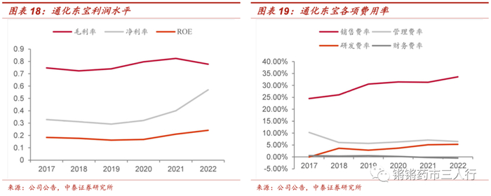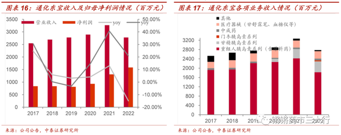 ■2018-2021 年营业收入由26.93亿元提升至32.68 亿元,CAGR 6.66%;归母净利润由8.39 亿元增至 13.08 亿元,CAGR 15.98%。2021 年公司胰岛素中标集采,受产品降价及渠道价格补差影响,2022年公司营收同比下降14.98%,扣非归母净利同比下降23.90%;基于公司出售所持特宝生物部分股权导致投资收益增加,2022年归母净利润为15.82 亿元(+20.92%)。2022年公司业绩短期承压,2023年有望迎来快速正增长。
