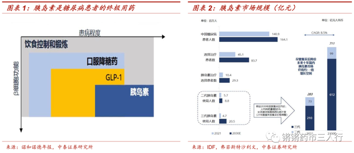 ■ 胰岛素市场空间广阔,胰岛素类似物成为主要驱动力。糖尿病属于慢性疾病,需要长期用药,而胰岛素是糖尿病患者中后期必须用药,其中I型糖尿病必须使用胰岛素,II型糖尿病患者随病程延长其胰岛β细胞功能不可避免逐渐下降,胰岛素的分泌能力逐渐减弱,在服用口服药一段时间后往往面临口服药失效的问题,胰岛素作为人体内唯一直接降低血糖的激素,是糖尿病患者的终极用药。据IDF数据,我国糖尿病患者人群1.41亿,其中选择胰岛素治疗的患者大概有1000万,预计2030年我国糖尿病人群将达到1.64亿,其中选择胰岛素治疗的患者大概有2930万。根据弗若斯特沙利文,预计2030年胰岛素市场规模将达到711亿元,2021-2030年 CAGR 8.5%,其中三代胰岛素将达到612亿元,2021-2030年CAGR 12.62%。
