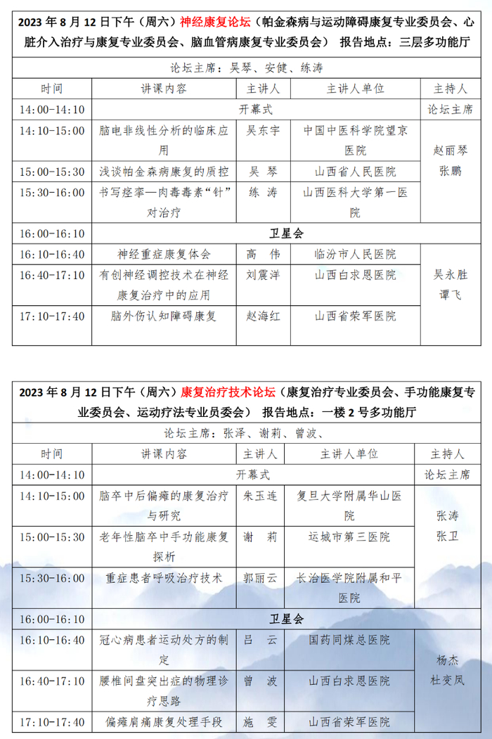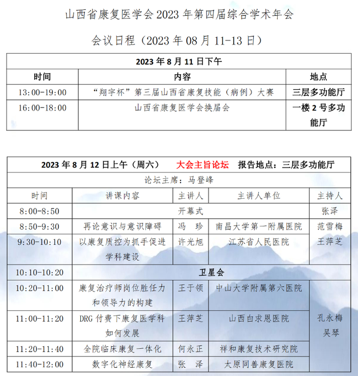 山西省康复医学会2023第四届三晋综合康复学术年会暨第三届山西省康复技能大赛定于8月11—13日在太原祥悦酒店召开。大会设主论坛及神经康复、肌骨与疼痛康复、康复治疗技术、儿童康复、吞咽障碍康复、康复护理等多个分论坛。会议将邀请省内外知名专家、教授莅临交流,且会前将举办山西省第三届康复技能大赛决赛。