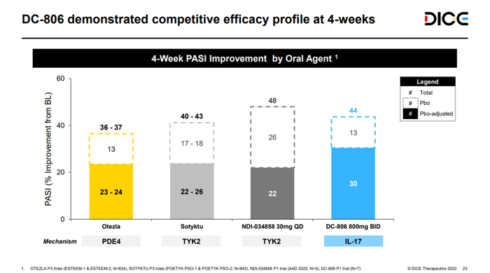 此外,与其他治疗银屑病的药物相比,高剂量DC-806在4周内表现出具有竞争力的疗效。目前DC-806正在进行2期临床,以进一步优化剂量并探索DC-806长期使用的治疗效果。