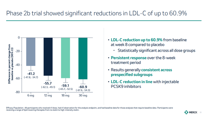 2期临床数据显示,在第8周时,相比安慰剂组,6mg/12mg/18mg/30mg四个剂量组的LDL-C水平较基线分别下降41.2%,55.7%,59.1%和60.9%(P<0.001)。