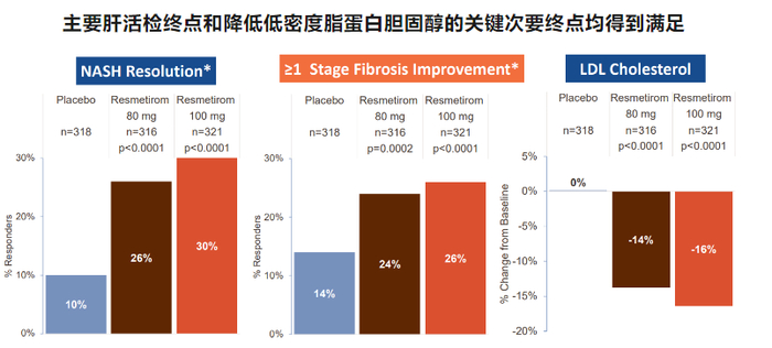 本次NDA的提交主要基于下面的研究结果,高、低剂量组和安慰剂组在NASH缓解且纤维化不恶化的主要终点上的发生率分别为30%、26%、10%;在纤维化改善≥1级且NASH不恶化的主要终点上,三个组的发生率为26%、24%、14%;在次要终点LDL-C降幅上,三个组分别为-16%、-14%、1%(图3)[2]。