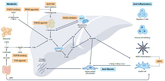 成纤维细胞生长因子21(FGF21)是一种主要由肝细胞分泌的蛋白,在小鼠、猴子及临床肥胖病人中具有降体重与血脂的效果,然而天然的FGF21蛋白在体内的半衰期非常短导致成药性差,因此人们对天然FGF21蛋白进行了重组改造与修饰来开发FGF21类似物治疗NASH。