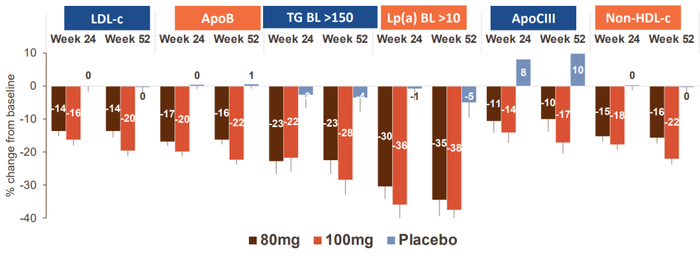 80mg以及100mg剂量组均达到关键次要终点,LDL-C、apoB、TG、MRI-PDFF以及CAP值均显著降低(p<0.0001)(图4)。