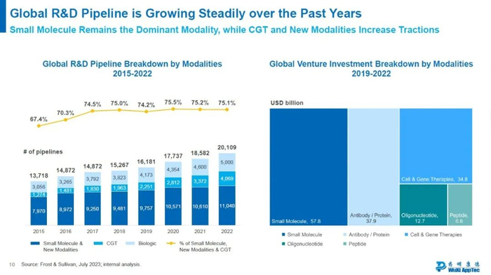 新药研发是一个创新驱动、科学引领的长期过程。为了加速新药好药早日问世,药企和生物科技公司在研发生产过程中寻求外部合作伙伴支持的比例也在持续上升,根据Frost & Sullivan数据,2023年这一比率约为50%,预计将在2032年增至62.2%。在细分领域,如多肽、寡核苷酸、靶向蛋白降解等新分子领域的这一比例增长更为迅速。