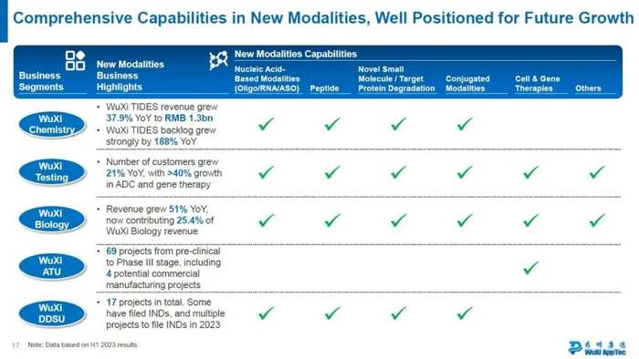 随着越来越多新分子类型的涌现,管线内越来越多的项目进入临床乃至商业化,新分子业务的增长已经成为药明康德所有板块的发展驱动力。隶属于化学业务的WuXi TIDES专注于提供以多肽和寡核苷酸为主的新分子CRDMO服务。截至今年6月,WuXi TIDES在手订单同比强劲增长188%,预计全年收入增长将超过70%,为客户持续创造价值,也为患者带去更多希望。