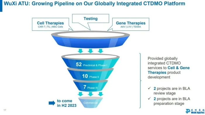 药明康德子公司药明生基(WuXi ATU)是专注于细胞和基因疗法的CTDMO。强大的测试能力是药明生基的独特优势,其内部的 T(测试)、D(研发)与M(生产)模块间可以有效协同,实现上下游业务转化,进一步强化客户粘性。随着越来越多的项目转化到后期,公司已形成稳定、可持续的项目管线,持续为合作伙伴提供高品质的服务。