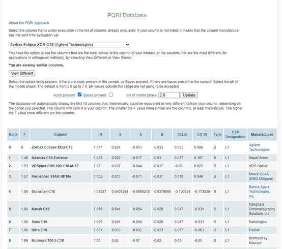 如果有没有类似的色谱柱可以替换,但是项目又比较紧急呢?USP给出了一个色谱柱性能差异的网站,我们可以在这个网站上查询我们是否有类似的色谱柱,具体的查询方式如下: