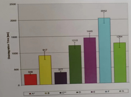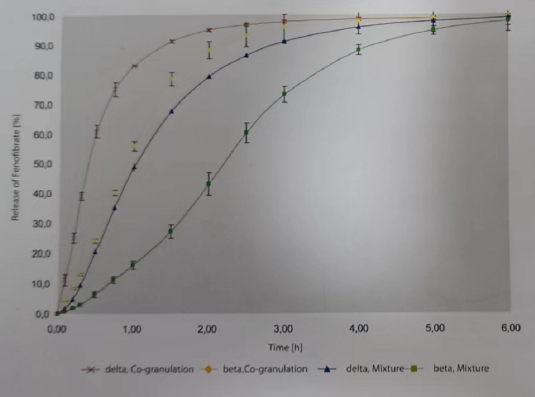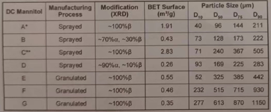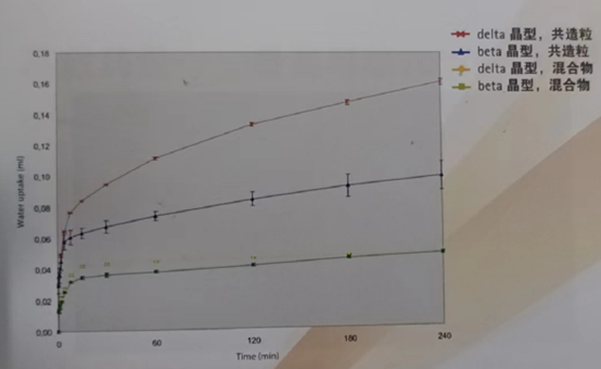δ晶型干露醇的制剂在研究中被观察到大幅领先的溶出,其原因在于其相对β晶型甘露醇显著增加的BET表面积和孔隙体积。另外,共造粒制剂的表现也优于单纯的物理混合物,该现象主要归功于更好的润湿作用和主药在甘露醇颗粒中更高的分散度。