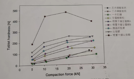 4、良好的可压性:填充剂作为处方中重要组成成份,其在处方中占比一般较大,处方中填充剂的主要作用是赋形以及改善总混物料的流动性及可压性,压片工序中填充剂的形变机制对片剂成型性起到关键作用。弹性形变压片时易产生应变速率敏感性,故处方中尽量避免大量使用弹性形变填充剂;而塑性形变和脆性形变填充剂则会降低其应变的敏感性,使其二者常常搭配使用,从而产生协同作用,使得总混物料具有极好的可压性。乳糖、甘露醇和磷酸钙盐是典型的脆性物料,而微晶纤维素、直压级甘露醇及湿法制粒用干露醇则是塑性辅料,一般情况下,脆性物料比塑性物料对润滑剂更敏感,处方中含有较低含量的硬脂酸镁则会严重降低物料的硬度;而添加甘露醇和微晶纤维素,可降低片剂在储存中硬度下降的风险,且添加甘露醇可降低处方对压片速度的敏感性,可以增加物料的成型性。微晶纤维素是可压性最高的填充剂之一,仅次于喷雾干燥的山梨醇。市售的甘露醇有很多种规格,其中可压性最好的是经过喷雾干燥的具有相当大比表面积的甘露醇,其可压性可与微晶纤维素相当。下图1显示了相关对比研究结果。