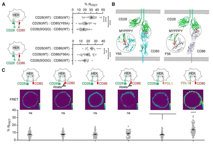 通过流式细胞术检测到CD8+T细胞同时表达CD28和B7,尤其是在抗原暴露后。通过显微镜技术,发现CD28与B7的共定位比与PD-L1的共定位更强,表明CD28和B7的物理距离更近。并通过共振能量转移技术(FRET),CD28与B7之间表现为受体光漂白后供体光恢复,而CD28与PD-L1之间则较低。此外CD28与B7之间的FRET被一种CTLA4的免疫球蛋白abatacept减弱,这种免疫球蛋白能与B7紧密结合并阻断CD28与B7的相互作用,因此B7:CD28存在顺式作用。